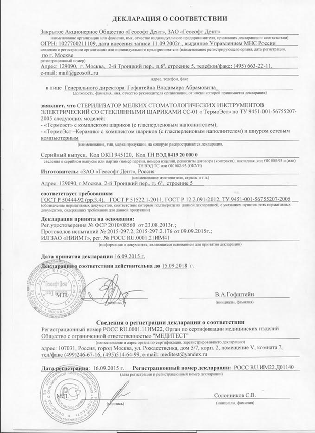 РУ и сертификаты для - ТермоЭст - малогабаритный гласперленовый стерилизатор настольного типа Geosoft