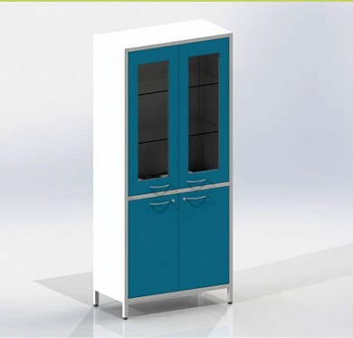 Шкаф двухстворчатый на ножках, верхняя секция с дверцами, изготовленных из металла с применением лазерной резки и  стекла, двумя полками (стекло), нижняя секция с металлическими дверцами с замками и  металлической полкой.
