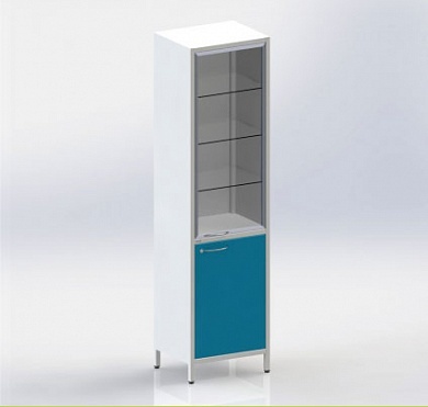 Шкаф одностворчатый на ножках, верхняя секция с дверцей из стекла в аллюминиевом профиле и 3-мя стеклянными полками, регулируемыми по высоте. Нижняя секция с металической дверцей с замком и металлической полкой.