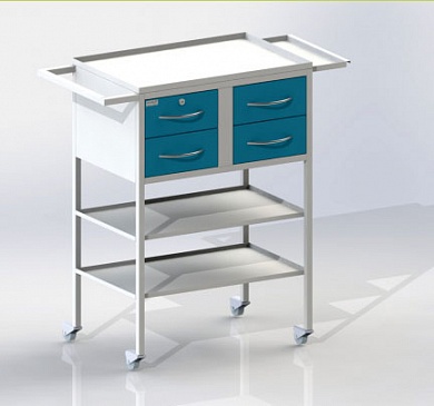 Столик передвижной на колесых опорах диаметром 50 мм, 4 ящика (один ящик оснащен замком), две полки, столешница из металла с полимерно-порошковым покрытием (с дополнительной выдвижной столешницей).