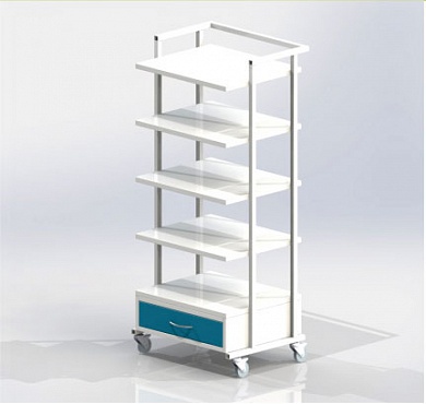Тележка приборная подкатная с 4-мя полками, внизу выдвижной ящик. Предназначена для размещения медицинских приборов, внизу выдвижной ящик для принадлежностей.