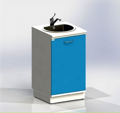 Тумба с дверцей, с вырезом в задней стенке для подвода коммуникаций, оснащена мойкой из нержавеющей стали, локтевым смесителем, сифоном.