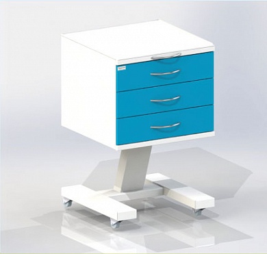 • Подкатная тумба - столик врача с тремя выдвижными ящиками, сверху стекло. Колесные опоры на резиновом ходу, две опоры с тормозным устройством.